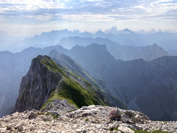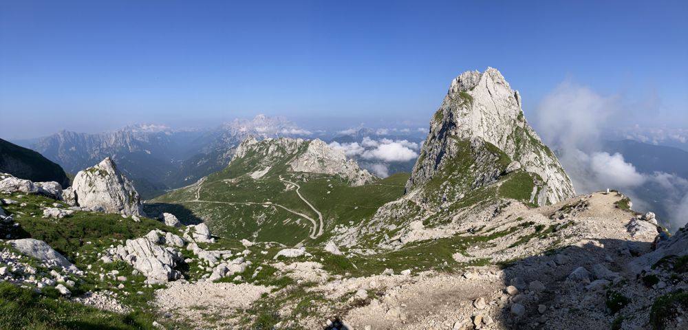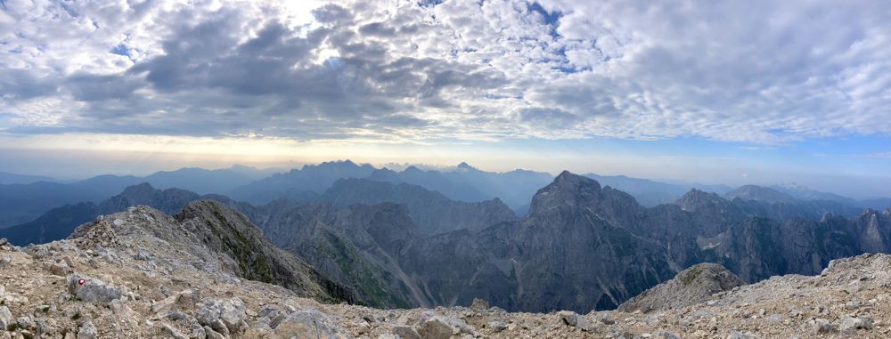 Der Ausblick vom Gipfel in der Umgebung ist traumhaft. Gegen 7:30 Uhr war der Himmel noch wolkenverhangen, aber in der nächsten Stunde kam die Sonne heraus und eröffnete einen grandiosen 360° Blick auf die Julischen Alpen und bis hin zum Triglav. An klaren Herbsttagen soll der Blick bis zur Adria reichen.