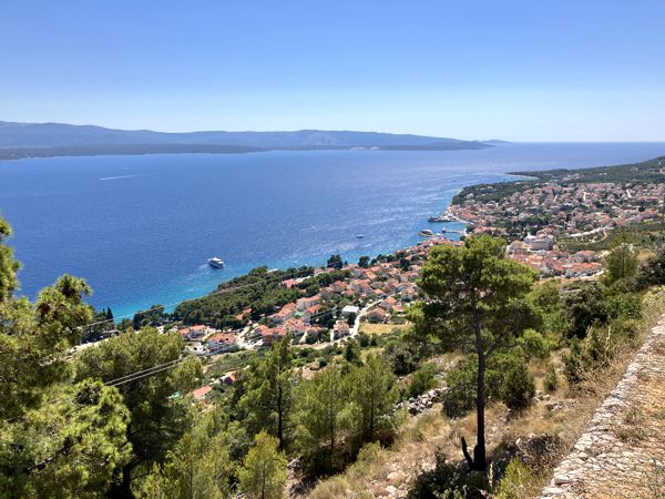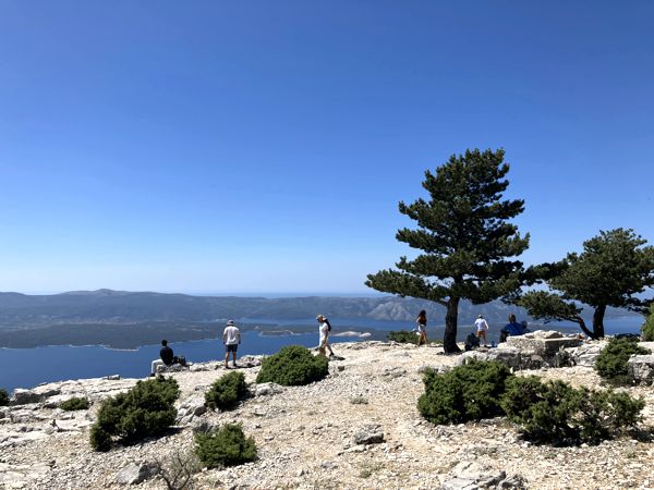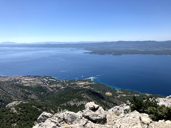Unser erstes Ziel war der höchste Berg aller kroatischen Inseln. Der Vidova Gora (778 m) kann recht einfach über die von Ost nach West verlaufende Inselstraße erreicht werden. Ein Stück vor Nerežišća gibt es einen Abzweig auf eine schmale Straße, die direkt zum Wanderparkplatz führt. Schon vom Parkplatz aus eröffnet sich ein grandioser Blick über die Inselwelt in der Ferne und über den Ort Bol mit dem Goldenen Horn direkt unterhalb des Gipfels. Der asphaltierte Weg hinauf auf dem Gipfel führt 500 m durch einen schattigen Wald bevor dann ein großer wenig ansehnlicher Funkmast erreicht wird. Etwas entfernt befinden sich verfallene Unterkünfte und ein schönes Gipfelkreuz (Votive cross). Der Vidova Gora kann auch in ca. 2,5 Stunden von Bol aus bestiegen werden, wovon im Sommer bei Temperaturen oft jenseits der 35°C abzuraten ist.