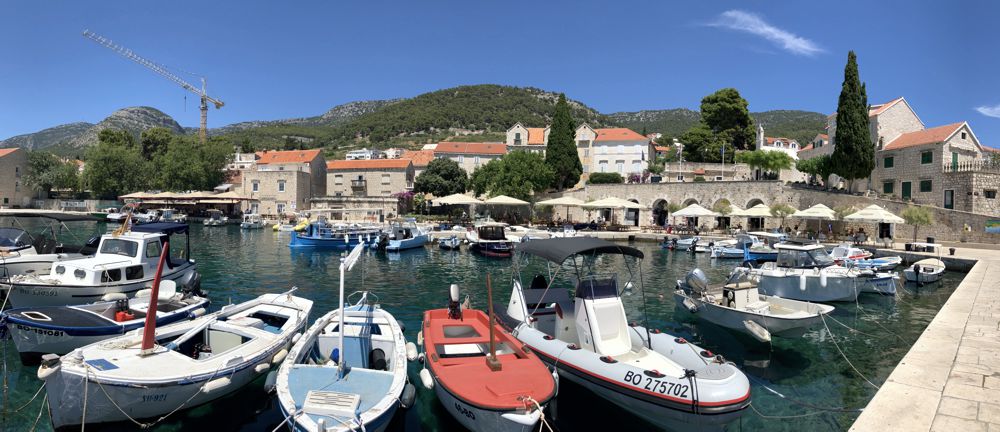 Wir parkten stattdessen auf der anderen Seite von Bol und gingen am traumhaften Strand Kotlina baden. Es gab Schatten unter großen Bäumen, es war sehr felsig, aber das Wasser war sehr klar und ideal zum Schnorcheln. Am anderen Ende des Strandes befindet sich das Dominikanerkloster von Bol an dessen Klippen ebenfalls tolle Schnorchelspots zu finden waren. Der kleine malerische Hafen kann vom Strand aus in 10 Minuten erreicht werden. Neben den kleinen Booten gibt es Restaurants und Souvenirgeschäfte.