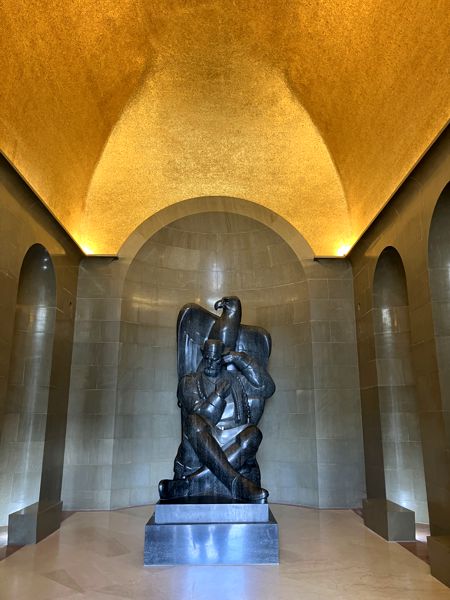 Statue von Petar II mit Adler unter Goldmosaik.