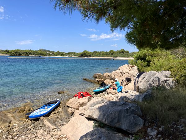 Nach einer Brotzeit umrundeten wir die Insel und paddelten noch bis Otok Radelj. Wir wären gern noch weiter gefahren, aber wir merkten, dass die Wellen zugenommen hatten und entschieden uns doch lieber zurück zufahren – ein SUP ist halt kein Kajak und schon gar kein hochseetaugliches Boot.
