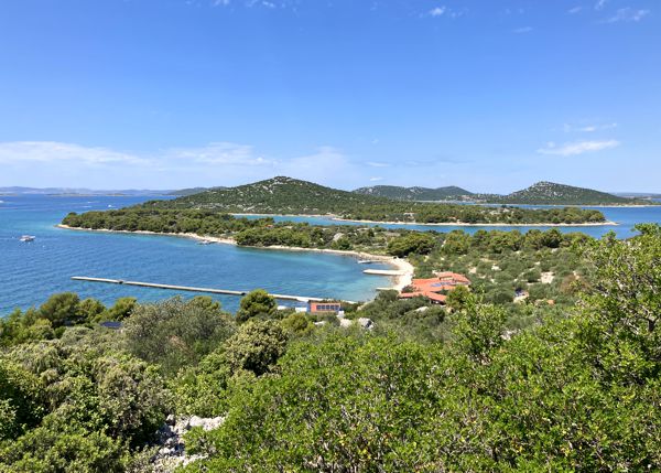 Auf Zminjak gibt es ein paar Wochenendhäuser und ein kleines Restaurant. Wir hielten am Ufer und schnorchelten in dem unglaublich klaren Wasser, ganz anders wie am Festland. Es gab Fische, Muscheln, Schnecken und Seegras in großer Vielfalt zu sehen. Ich entschied mich auf den höchsten Gipfel der Insel zu steigen. Versuchte es erst querfeldein, kam aber durch das dornige Gestrüpp nicht weit. Letztendlich umrundete ich die Insel bis zum Restaurant und folgte dann einem Trampelpfad auf den 32 Meter hohen Aussichtspunkt über die Inselwelt. Einfach wunderschön.