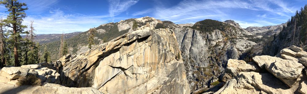 Ich wählte zunächst den Weg über den Watchtower (2735 m), weil ich endlich einen freien Blick auf die Berge haben wollte. Ab dem Watchtower führt der Pfad auf einem schmalen Band weiter im Schatten aufwärts. Irgendwo tief unter mir befanden sich die Topopah Falls.