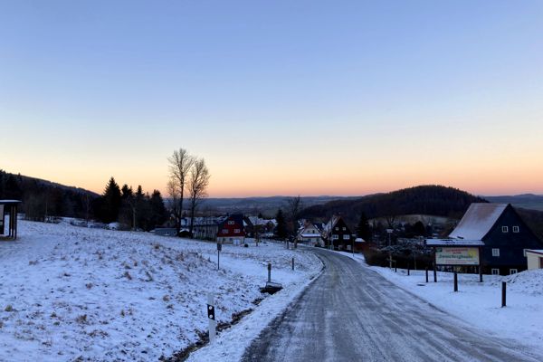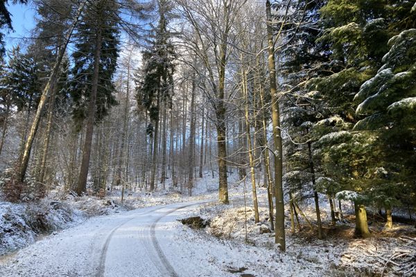Der Ausgangspunkt meiner Wanderung war das kleine Dorf Waltersdorf am Fuße der Lausche. Am Wanderparkplatz im Ortsteil „Neu Sorge“ begann ich meine Tour zunächst auf den westlich gelegenen Weberberg (Vyhlídka, 711 m). Ein breiter Forstweg führte durch schneebedeckten Wald zügig in die Höhe. Der „Gipfel“ befindet sich auf tschechischer Seite – ist im Wald aber kaum auszumachen. Irgendwann merkte ich, dass der Weg wieder bergab führte.