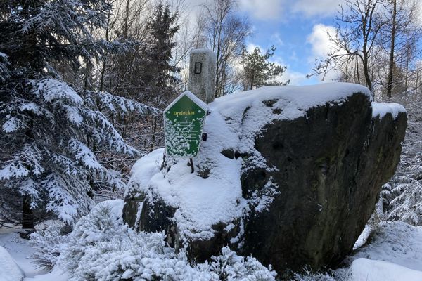 In Richtung Süden befindet sich der Dreiecker (Trojhran, 680 m) - ein alter Grenzstein auf der deutsch-böhmischen Grenze. Laut Tafel trafen sich früher hier die Herrschaftsbereiche von Reichsstadt, Rumburg und Zittau.