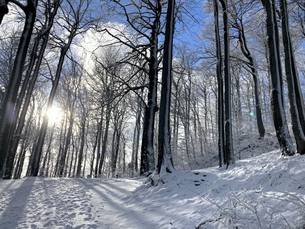 Der Weg zurück nach Waltersdorf war bis auf ein paar Abkürzungen identisch zum Hinweg und sehr, sehr lang. Schon auf dem Hochwald war ich erschöpft, musste aber noch zum Parkplatz zurück. Kurz nach Sonnenuntergang erreichte ich das Auto. Die Tour war schön, aber mit 26 km sehr lang. Das Laufen m Schnee kostete zusätzliche Kraft. Die Ausblicke von der Lausche und vom Hochwald sind beeindruckend, die Nonnenfelsen waren für mich überraschend und die Besteigung des Weberbergs (bedeutete 6 km zusätzlich) war unnötig, weil es nichts zu sehen gab. Parken in der Mitte der Tour, z.B. in Jonsdorf, wäre effektiver gewesen.