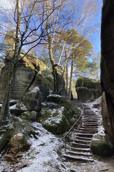 Von der Lausche führte ein breiter Forstweg über die Alte Wache bis hinab zum Nonnenfelsen bei Jonsdorf. Die Nonnenfelsen sind Sandsteinfelsen und liegen labyrinthartig im Wald versteckt. Über schmale Wege und Stiege nähert man sich dem Ortsrand von Jonsdorf. In einem Wechsel von offenen Wiesen und Wäldern mit zugefrorenen Seen wird der Ort Hain in Richtung Süden durchquert, bevor dann der finale Aufstieg zum Hochwald (Hvozd, 750 m) beginnt.