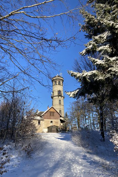 Der Hochwald ist ein weithin sichtbarer Doppelgipfel genau auf der Grenze zwischen Deutschland und Tschechien. Auf dem südlichen Gipfel befindet sich die Hochwaldbaude. Der nördliche Gipfel beherbergt einen 1892 erbauten Aussichtsturm aus Stein. Wie schon zuvor auf der Lausche ist die Aussicht besonders Richtung Tschechien sehr beeindruckend. Am Nachmittag war das Wetter deutlich besser wie am Vormittag und mein Blick reichte bis zum markanten Ještěd und weiter zur Schneekoppe ins Riesengebirge. Nördlich des Berges erstreckt sich die Stadt Oybin.