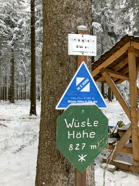 Die Tour begann bei noch komplett wolkenverhangenem Himmel im tiefverschneiten Wald. Das erste und leicht zu erreichende Ziel war die Helbigshöhe / Wüste Höhe (827 m). Der Gipfel ist eher eine Minikuppe mitten im Wald. Ohne Schild würde dieser Gipfel kaum wahrgenommen werden.