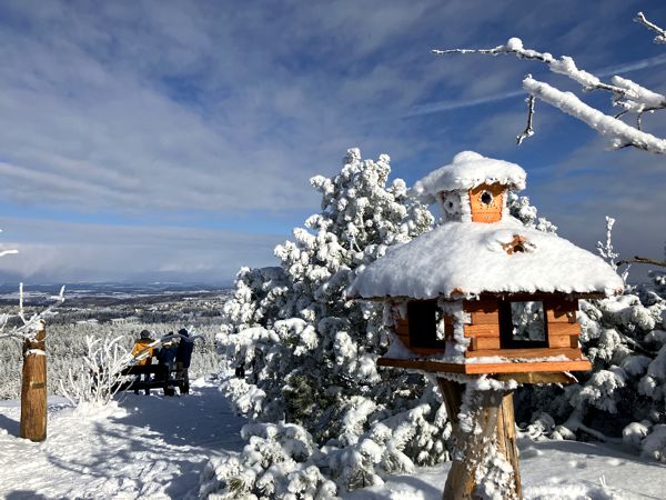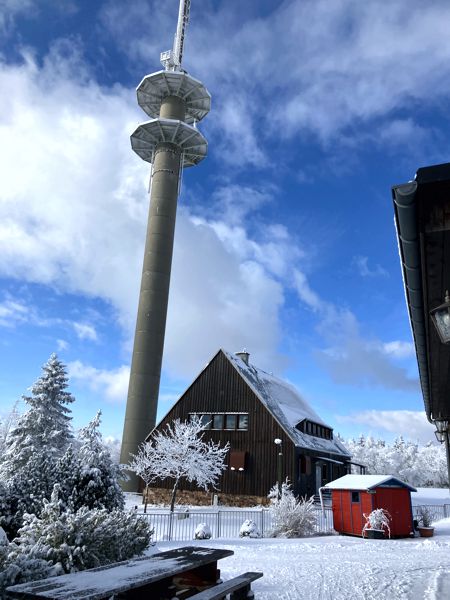 Über kleine schmale Weg Richtung Wüster Teich „stiegen“ ich wieder vom Gipfel hinab, ohne das Gefälle zu bemerken. Deutlich anstrengender war dann der lange steile Aufstieg über den I-Flügel zum Kahleberg (905 m – eigentlich ein 9000er, zählt nicht zu den offiziellen 14 Achttausendern im Osterzgebirge). Auf den letzten Metern zum Kahleberg begann sich plötzlich die Wolkendecke zu öffnen und die ersten blauen Lücken waren zu erkennen. Die Kahleberghütte war gut besucht und eröffnet bei jetzt Sonnenschein einen tollen Blick über den tiefverschneiten Wald und die zugefrorenen Galgenteiche.