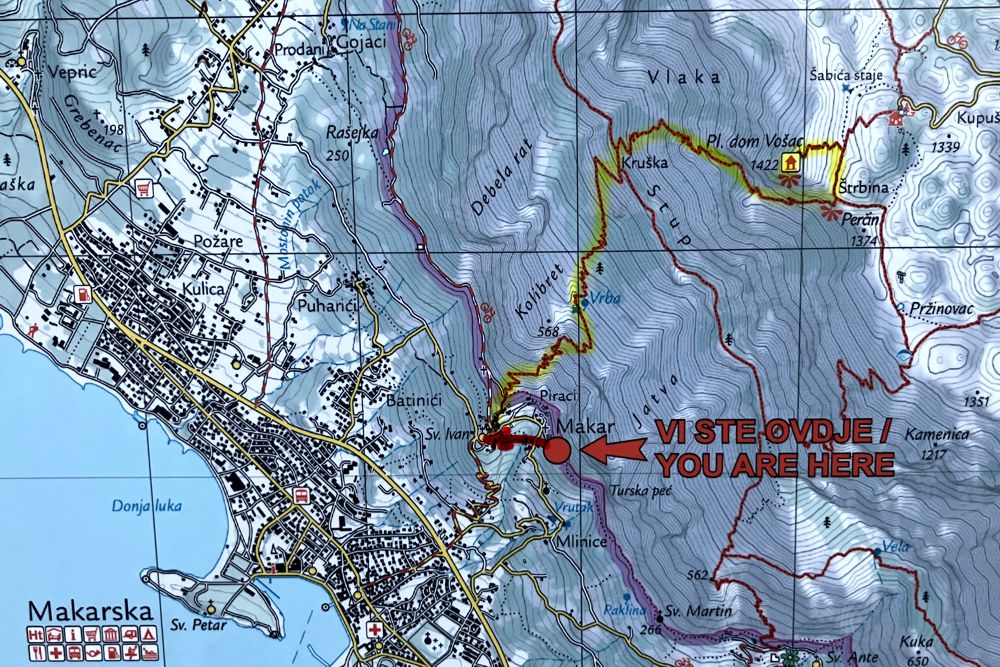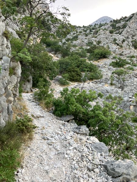 Die Wanderung beginnt an der Kirche in Makar. Das kleine Dorf, was über eine schmale kurvenreiche Straße zu erreichen ist, liegt oberhalb von Makarska auf 200 m Höhe und es gibt einen großen Parkplatz. Der Weg ist von Anfang an gut ausgeschildert und fast durchgängig bis nach oben gut „gepflastert“. Nach den letzten Häusern führt der Pfad in engen Serpentinen steil bergauf. Nach ca. 45 Minuten verlässt der Weg das steile Tal und führt in großen langgezogenen Serpentinen durch einen Wald weiter in die Höhe bis zu zwei Kreuzungen auf 850 m Höhe, wo der Vošac ausgeschildert ist.