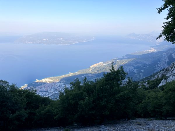 Ich wollte gern einen der Berge im Biokovo Gebirge besteigen. Das Kaltsteingebirge erhebt sich karg und mit nur wenig Schatten bis auf über 1700 m Höhe. Der höchste Punkt ist der Sveti Jure (1762 m). Der höchste Gipfel kann entweder über eine extrem lange Tagestour (9-10 Stunden, im Sommer kaum machbar) oder über eine sehr schmale kostenpflichtige Mautstraße erreicht werden. Ich wollte aber gern eine richtige Wandertour machen, weshalb meine Wahl auf den Vošac, den alles überragenden Gipfel von Makarska, fiel. Ja richtig, auch der Vošac kann von der Mautstraße aus leicht erreicht werden, aber ist eben auch in nur 5-6 Stunden (return) zu Fuß wanderbar.